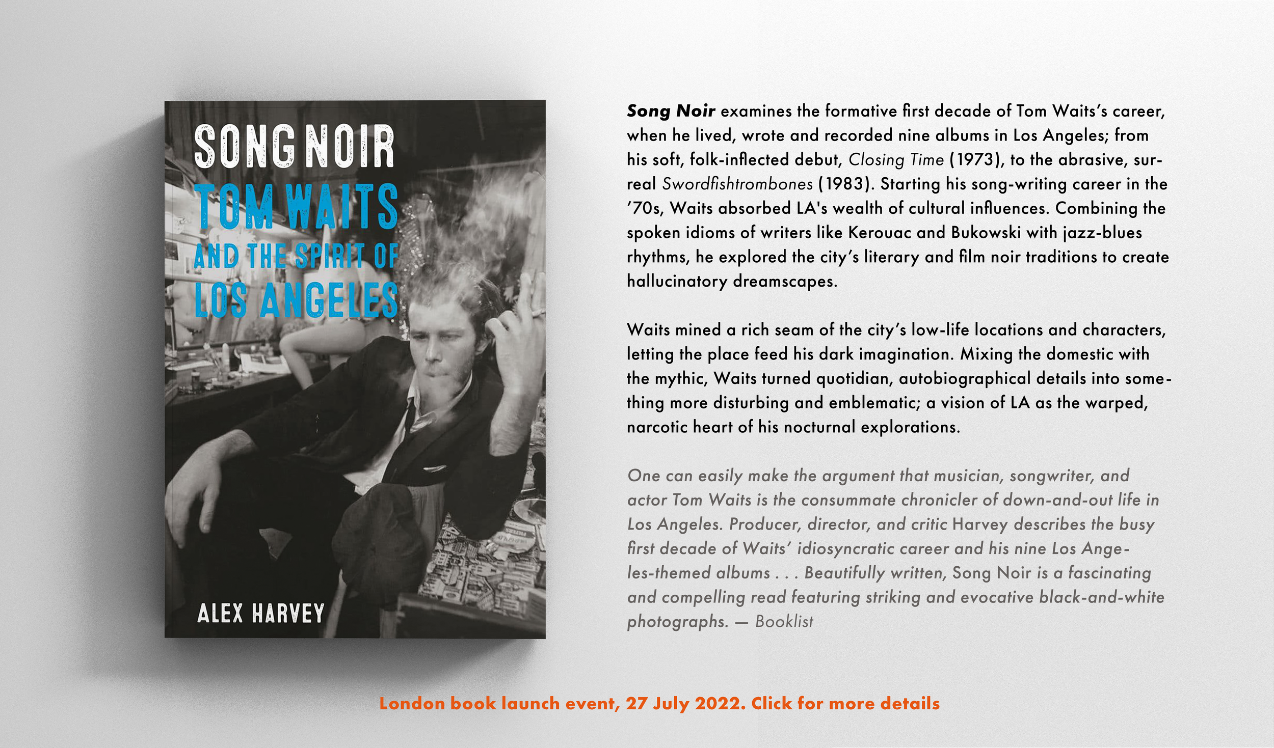 Alex Harvey, author of Song Noir: Tom Waits and the Spirit of Los Angeles, recently held a launch party and reading at Let It Roll records Kentish Town Rd, London (27th July), where a great time was had by all (some images from Let It Roll, above). You can catch Alex on the remainder of his book tour …